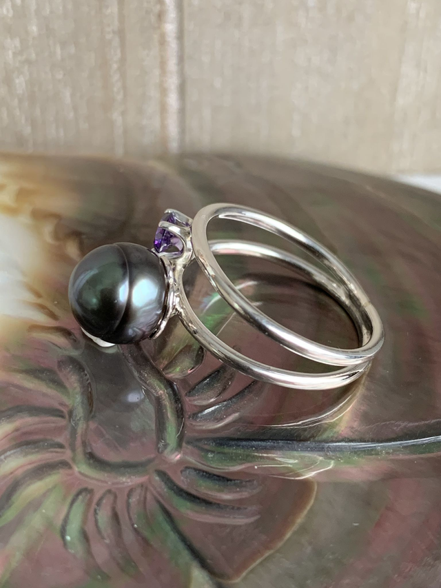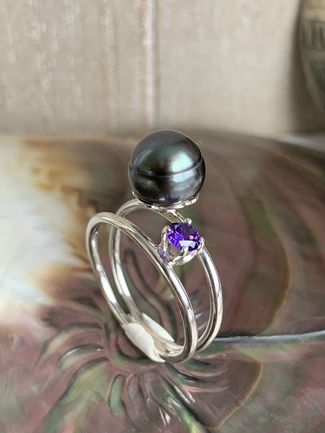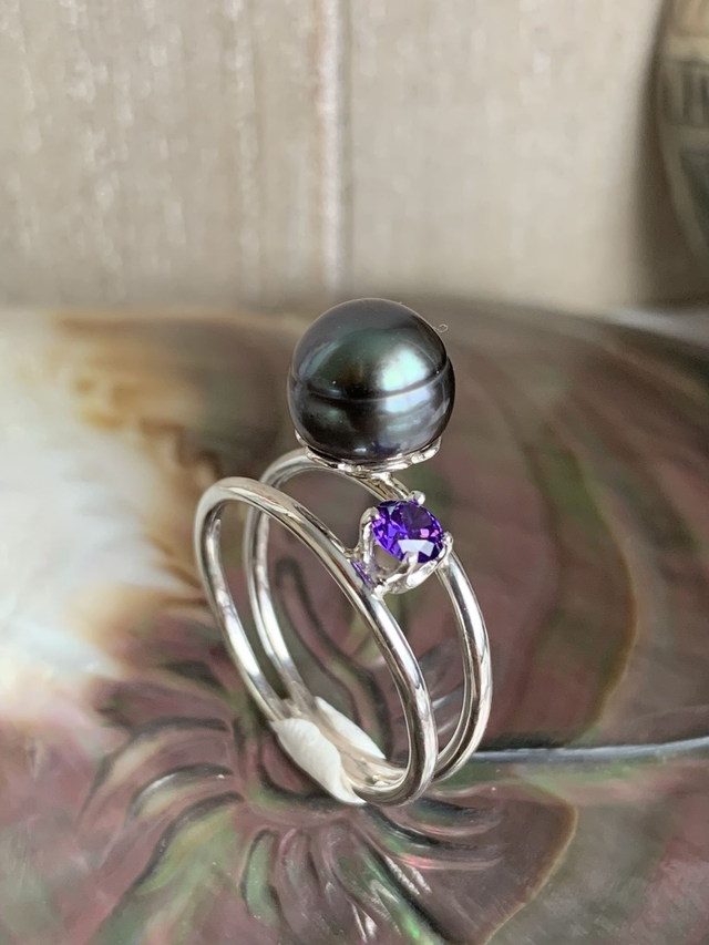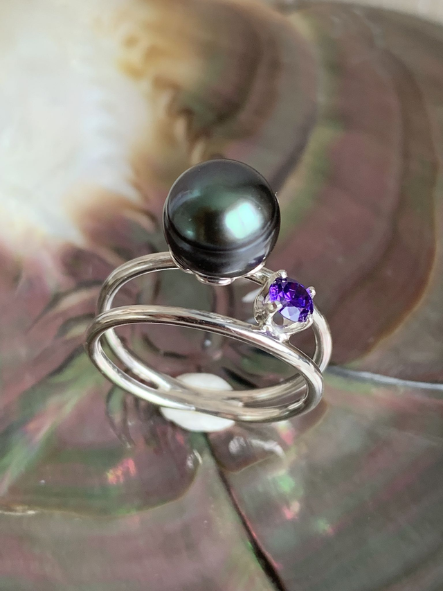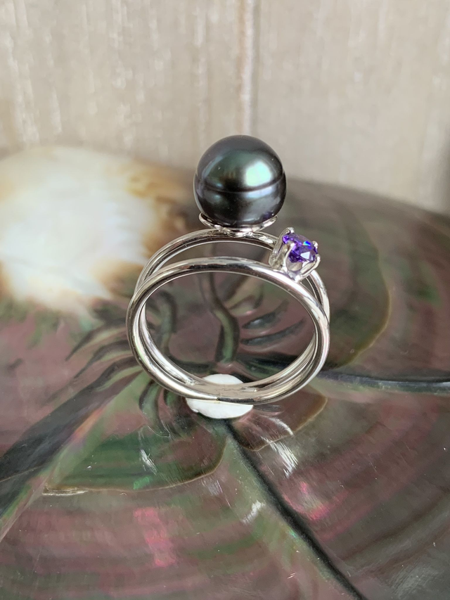 Très belle bague en argent 925, accompagnée d'une jolie perle de culture de Tahiti et d'un oxyde de zirconium violet.