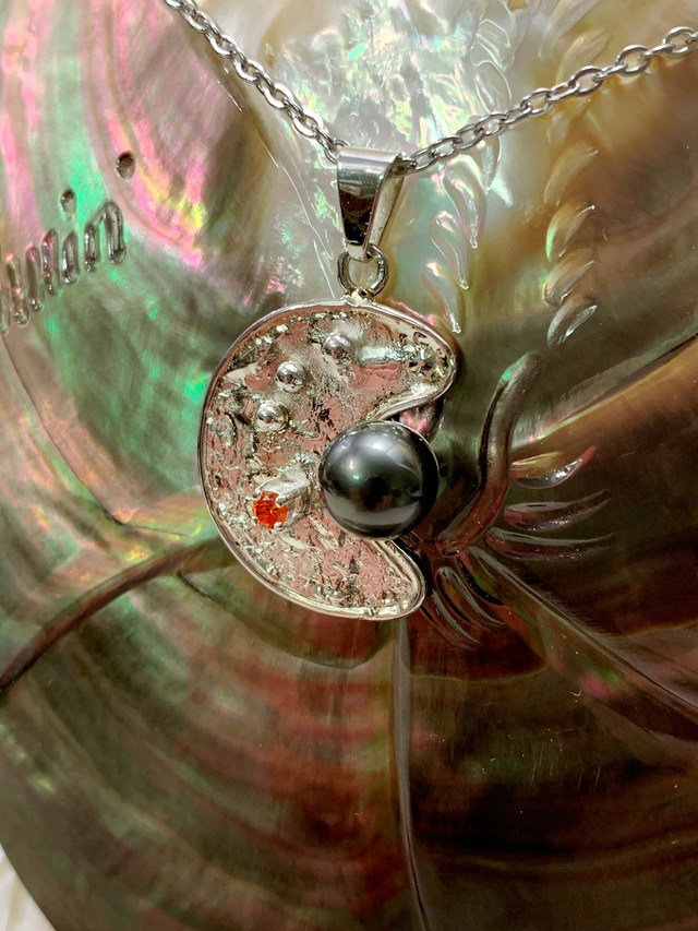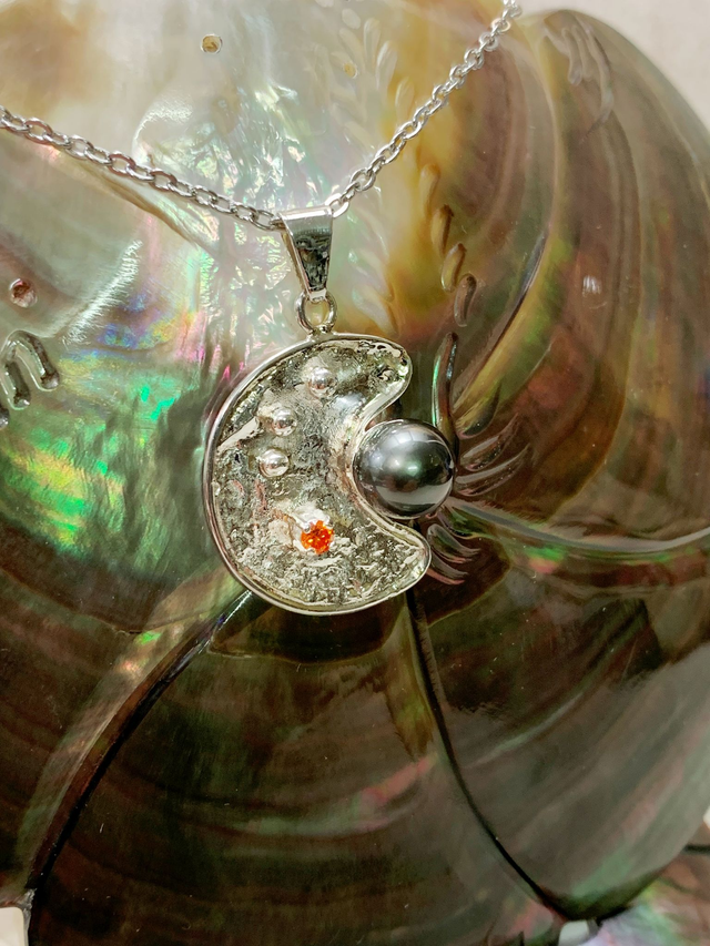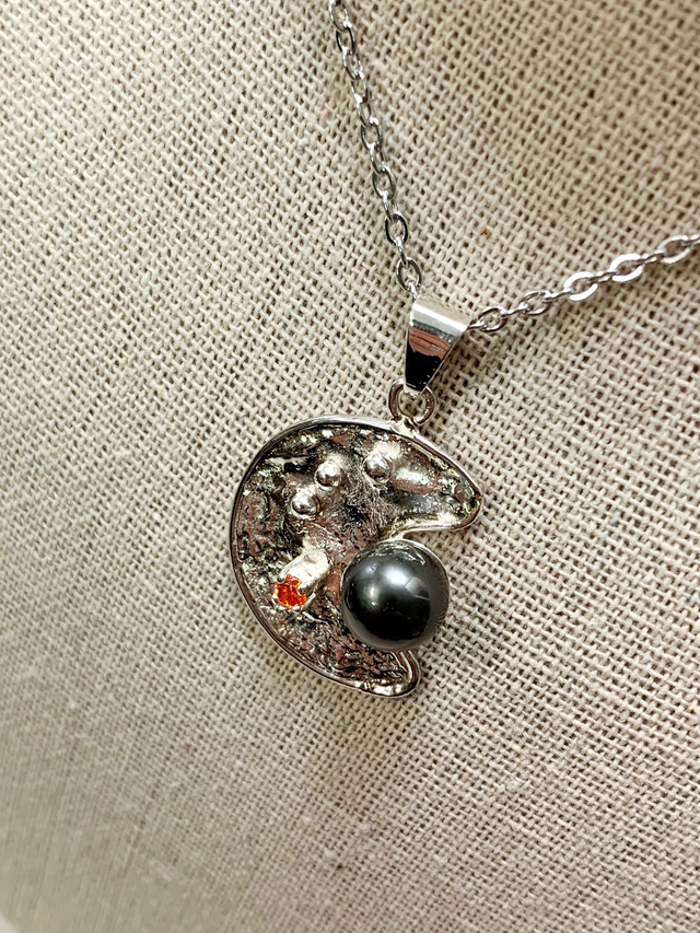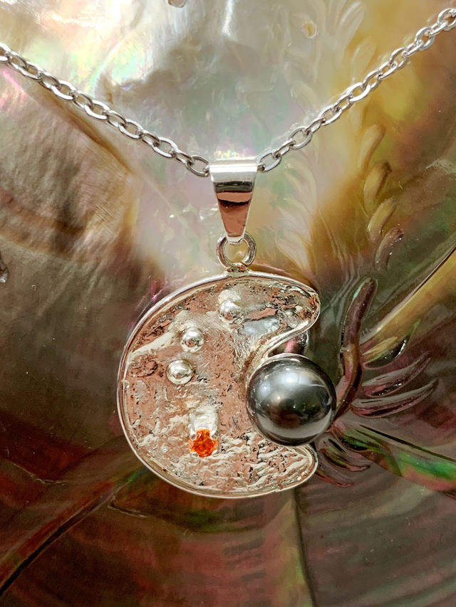 Pendentif en argent 925, travaillé avec de la plaque d'argent réticulée, 3 petites boules en argent, un oxyde de zirconium orange de 3mm sur un chaton 4 griffes, le tout surmonté d'une très belle perle de Tahiti.