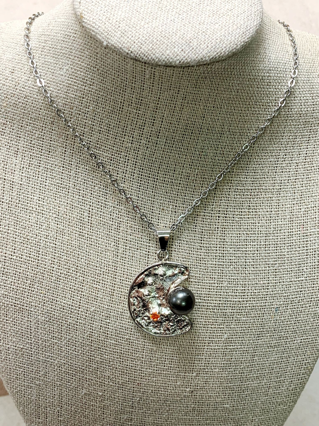 J'ai voulu, d'après ma vision, recréer une partie de notre galaxie. Il y à la Lune en argent, la perle étant pour moi la terre et l'oxyde de zirconium représentant à mes yeux la planète Mars. Pour les boules en argent, c'est à vous d'imaginer vos planètes.