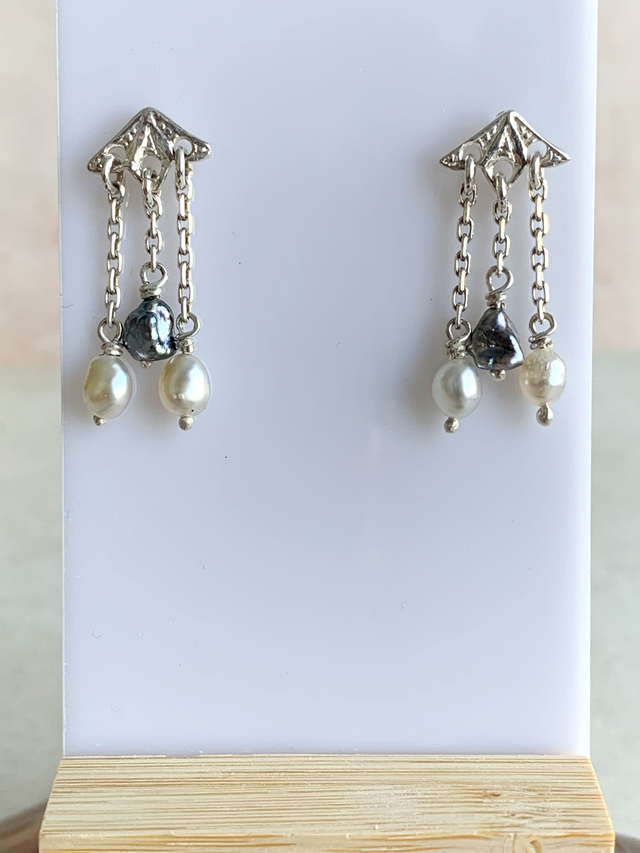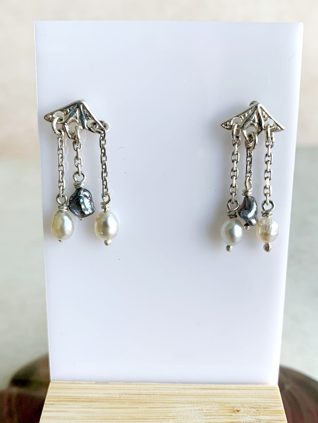 Boucles d'oreilles en argent 925, avec 6 véritables keshis de Tahiti. Les keshis sont montés sur chainettes argent 925 par queue de cochon. Le haut du corps des boucles d'oreilles est réalisé dans de la plaque d'argent et travaillé à la lime et à l'échoppe pour les petites gravures.